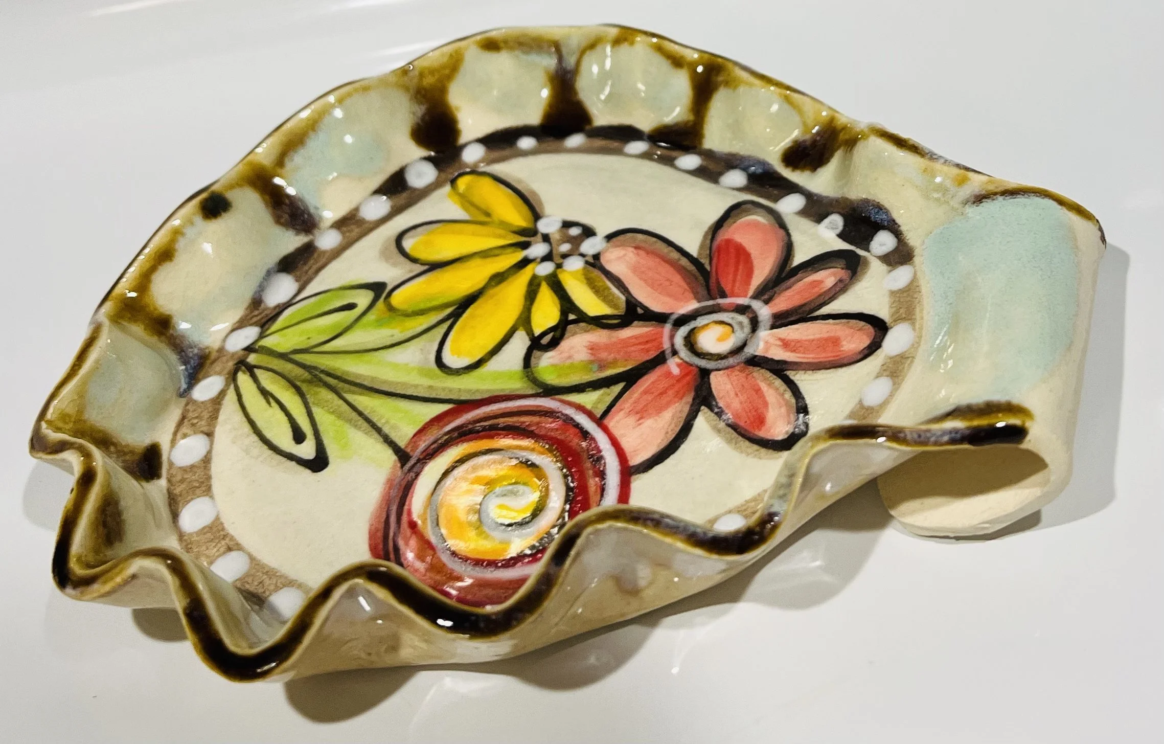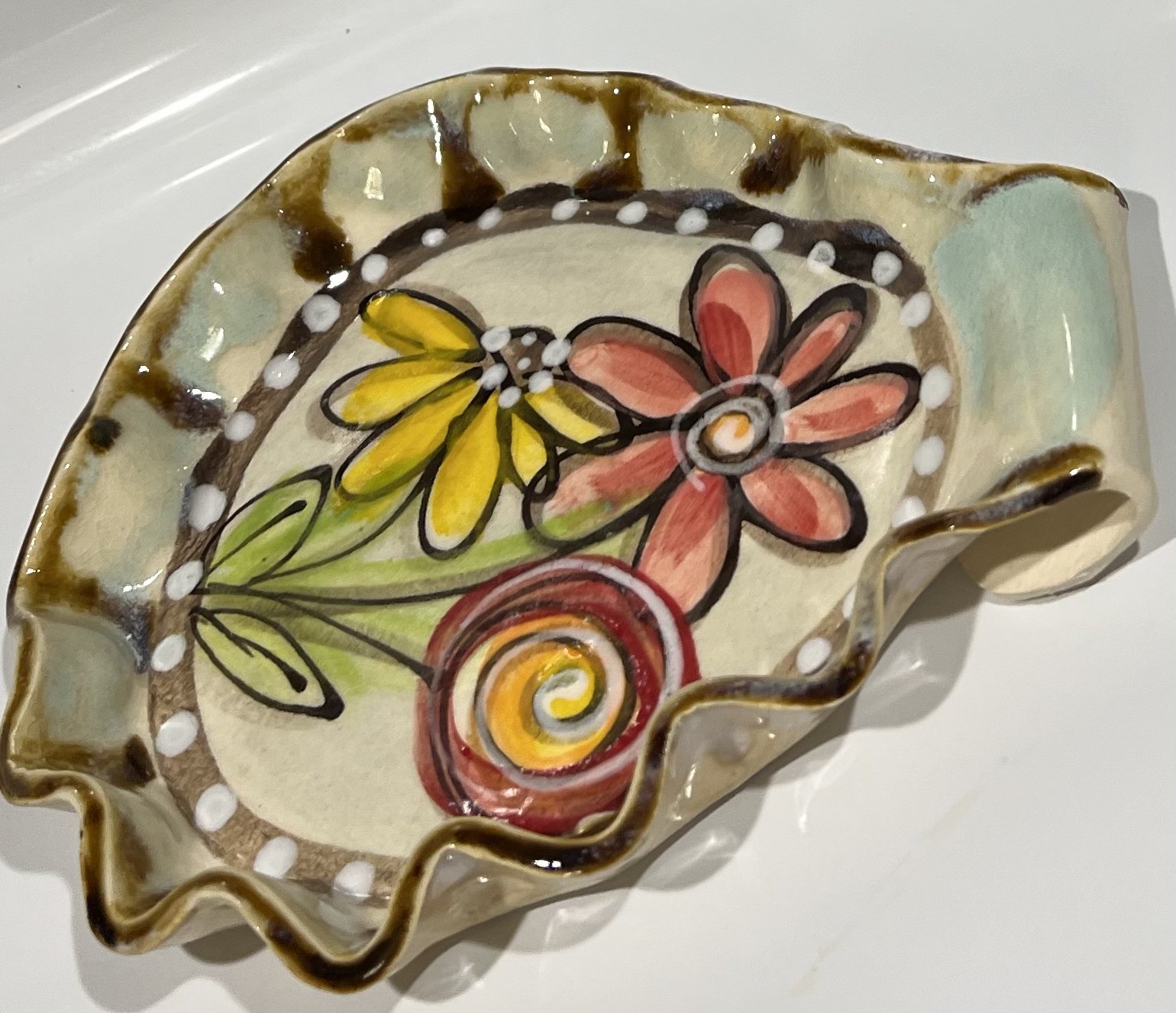 Hand made and painted stoneware spoon rest. Such a beautiful way to bring joy and whimsy into the kitchen. No two are alike. Approximately 5”x5”x0.5” dimensions. Food, oven, and dishwasher safe.